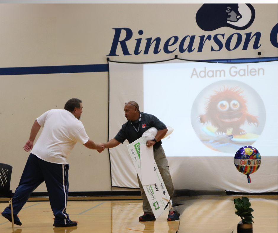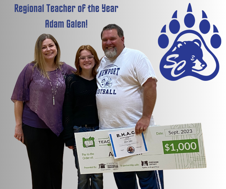 En una asamblea escolar el miércoles, los funcionarios de la Lotería de Oregon anunciaron el premio de Galen y le entregaron un cheque de $1,000 dólares. Galen dijo que se siente honrado de ser reconocido. “Estoy muy emocionado”, dijo Galen. “Me encanta ser capaz de inspirar a la gente y esto es sólo una manera más de inspirar a los maestros aquí, así como a los niños y adultos jóvenes a convertirse en maestros”.